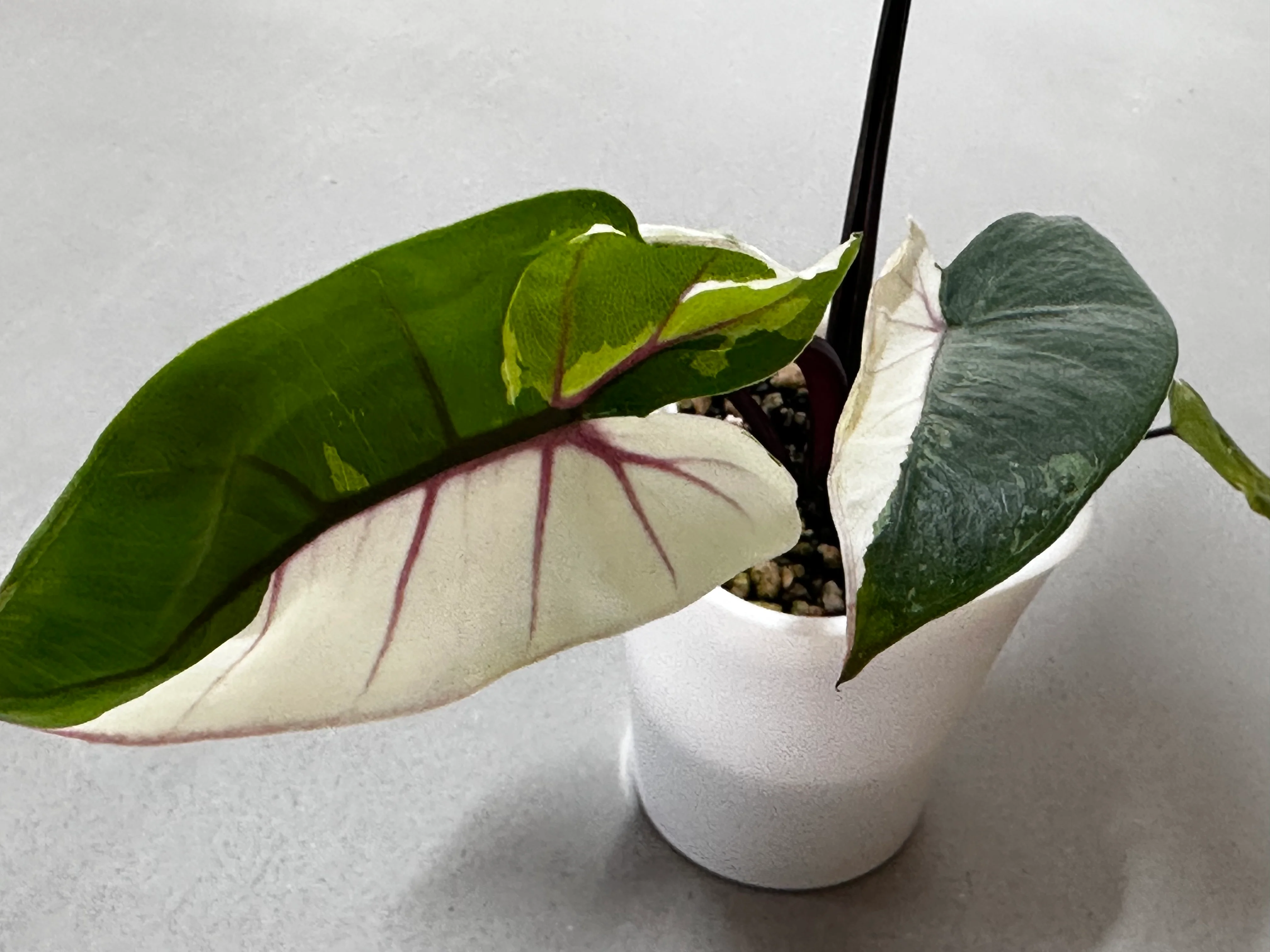 The Alocasia Macrorrhizos ‘Black Stem’ Albo has, as the name already hints, dark purple stems that are almost black. This colouring also runs through the veins giving a deep purple colouring. This Albo version is simply stunning! Stunning half moon variegation, and deep purple running through. This is Perfect if you are looking for something less ordinary! Buy Alocasia Macrorrhizos ‘Black Stem’ from The Alocasia Company.