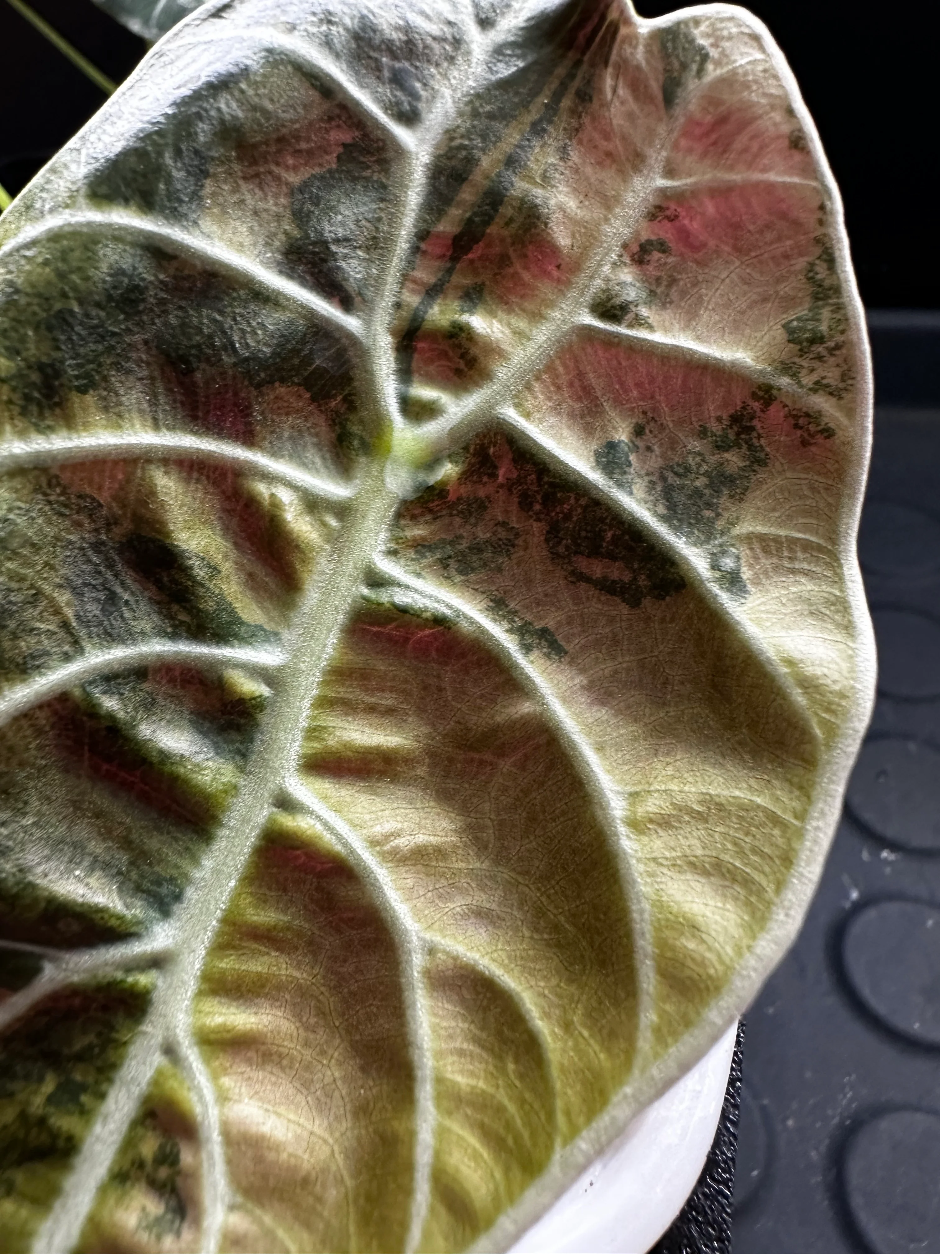 Ideal for serious Alocasia collectors seeking something truly distinctive, the Doff variety's matte velvety texture combined with striking pink variegation ensures this specimen stands out from glossy-leaved varieties. The dramatic contrast between the dark base and prominent pink variegation makes this rare collector's houseplant an unforgettable centerpiece that showcases both exceptional coloration and unique textural qualities.